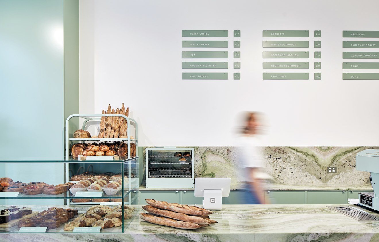 Bread Clubβs double doors open to a bright space featuring white rendered brick walls and seating for 20 on mint-green banquettes and benches overlooking Queensberry Street. A matching mint-green La Marzocco espresso machine sits on a striking green quartzite counter, surrounded by displays of breads and pastries.