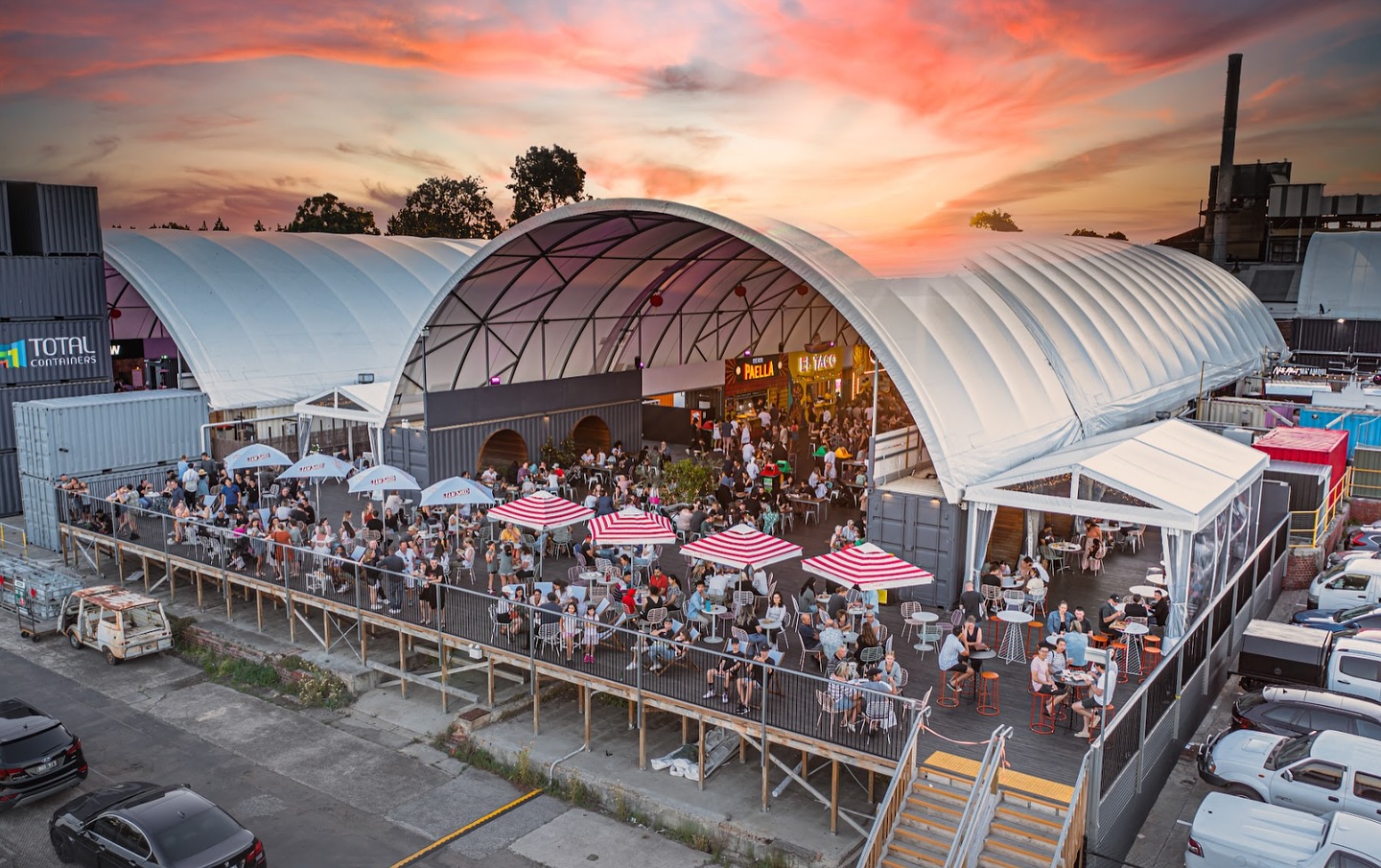 An open-air bar built from stacked shipping containers, adorned with lush greenery and vibrant projections. A lively crowd enjoys craft cocktails, rotating beers, and DJ sets under the city lights.