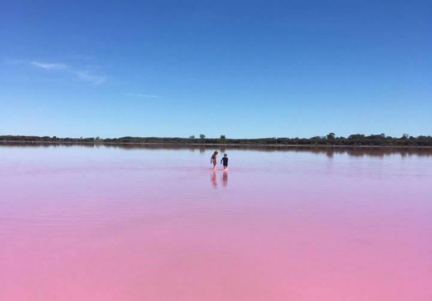 The lakeโs very on-trend pink hue, which comes from a pigment secreted by microscopic algae, is an Instagrammerโs dream.