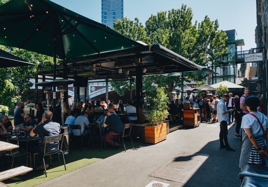 Follow a dark plunging staircase opposite Flinders Street Station to find an alfresco beer hall right on the Yarra. It’s dotted with umbrellas and leafy trees. Its straightforward menu of bar snacks (think charcuterie and gourmet hotdogs) and accessible drinks list make it one of Melbourne’s more popular watering holes.