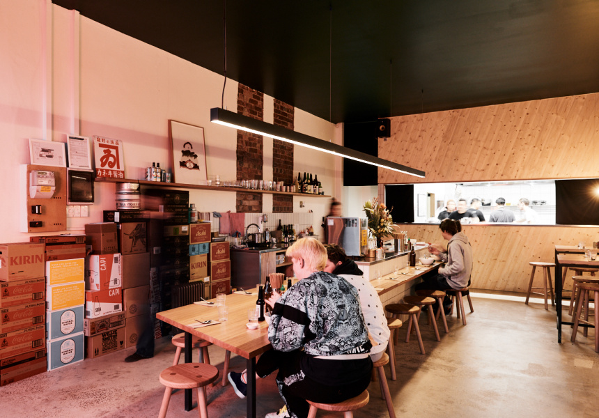 Take a low stool and slurp up Tokyo-style ramen loaded with handmade wheat noodles and untraditional toppings.