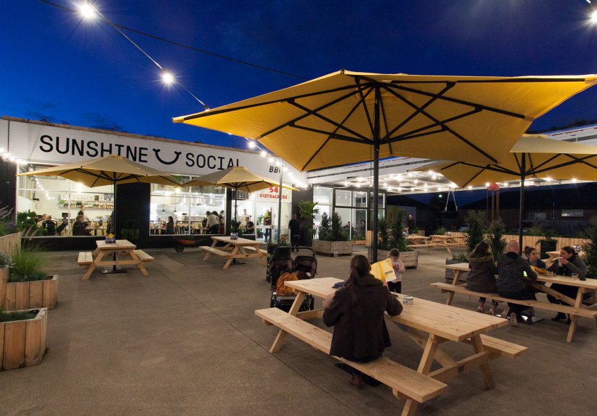 Rotisserie chicken and chocolate ripple cake in a former petrol station.